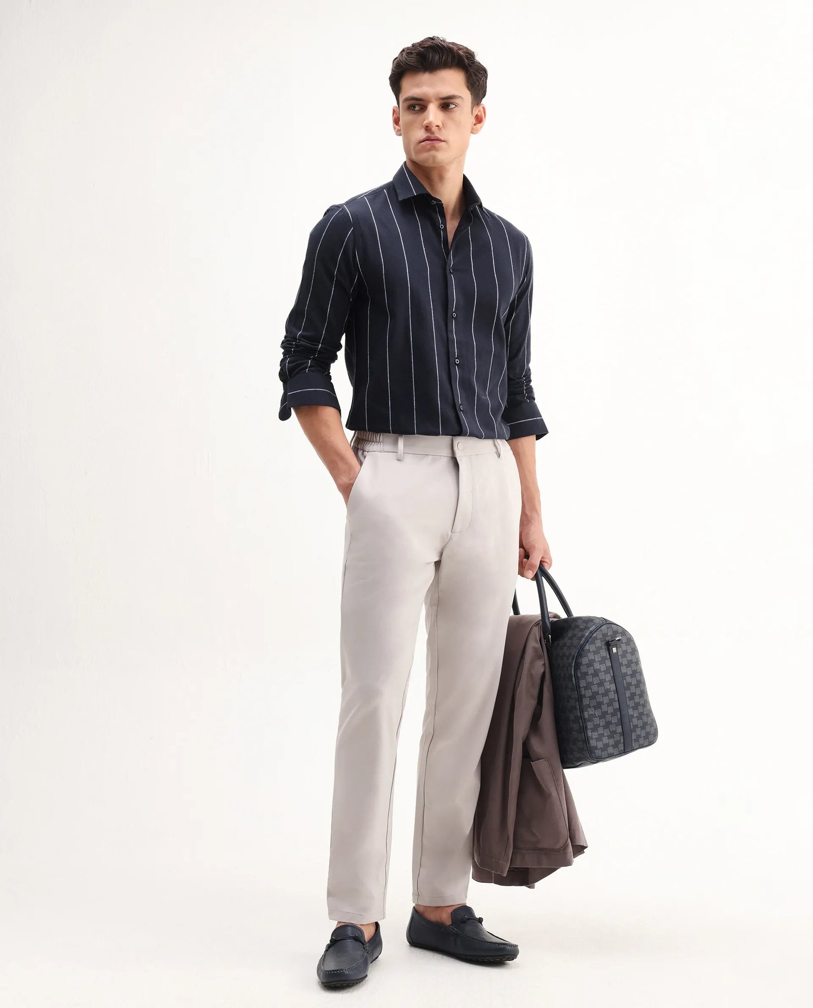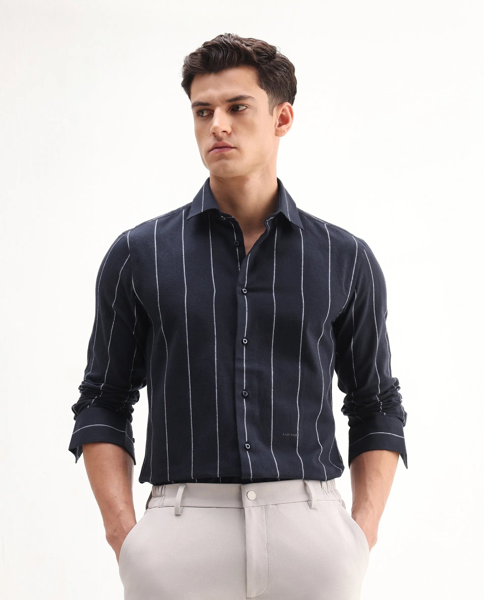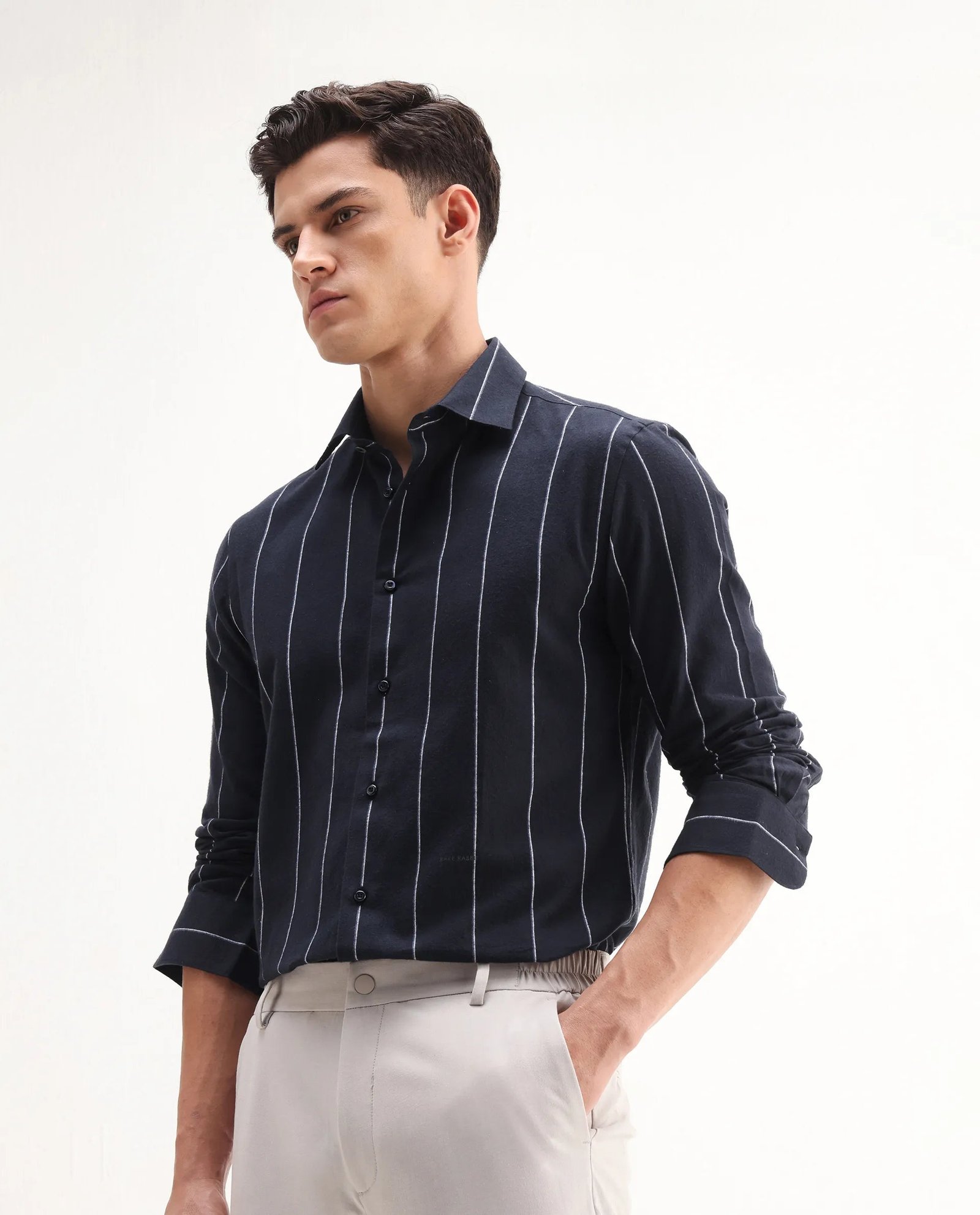 This Rare Rabbit men’s shirt features a full-sleeve design crafted from premium navy cotton fabric. ensuring comfort and breathability. The collared neck and subtle stripes add a refined touch. making it suitable for both formal and casual occasions. Its tailored fit offers a polished silhouette. reflecting expert attention to detail and quality craftsmanship.