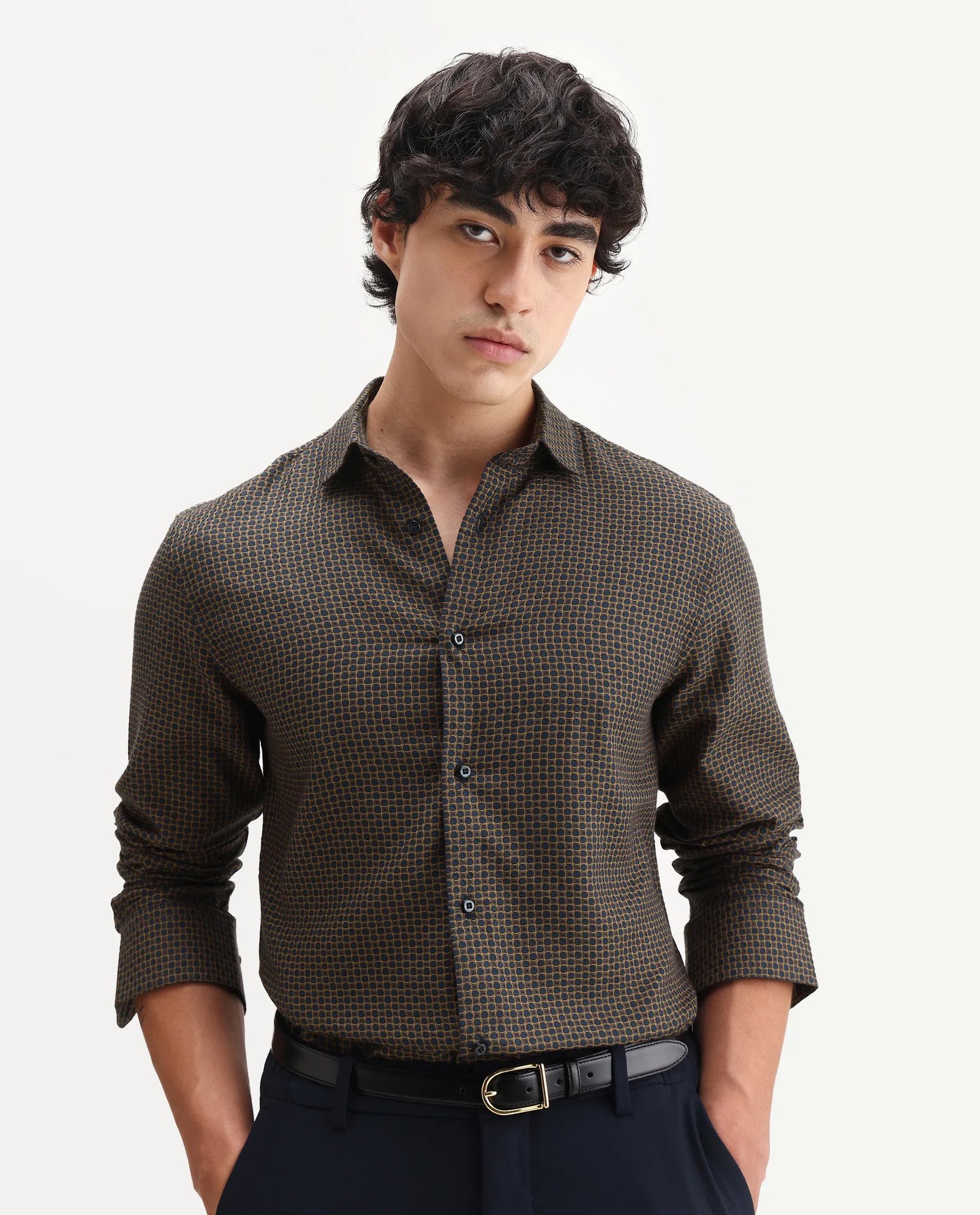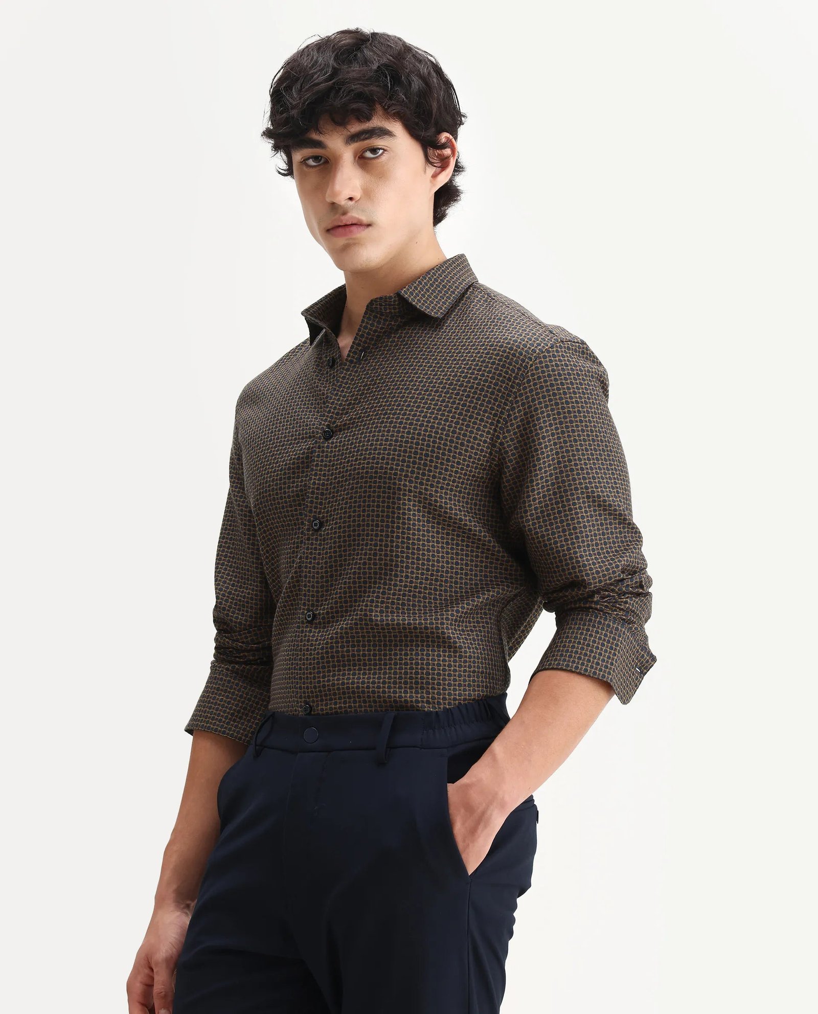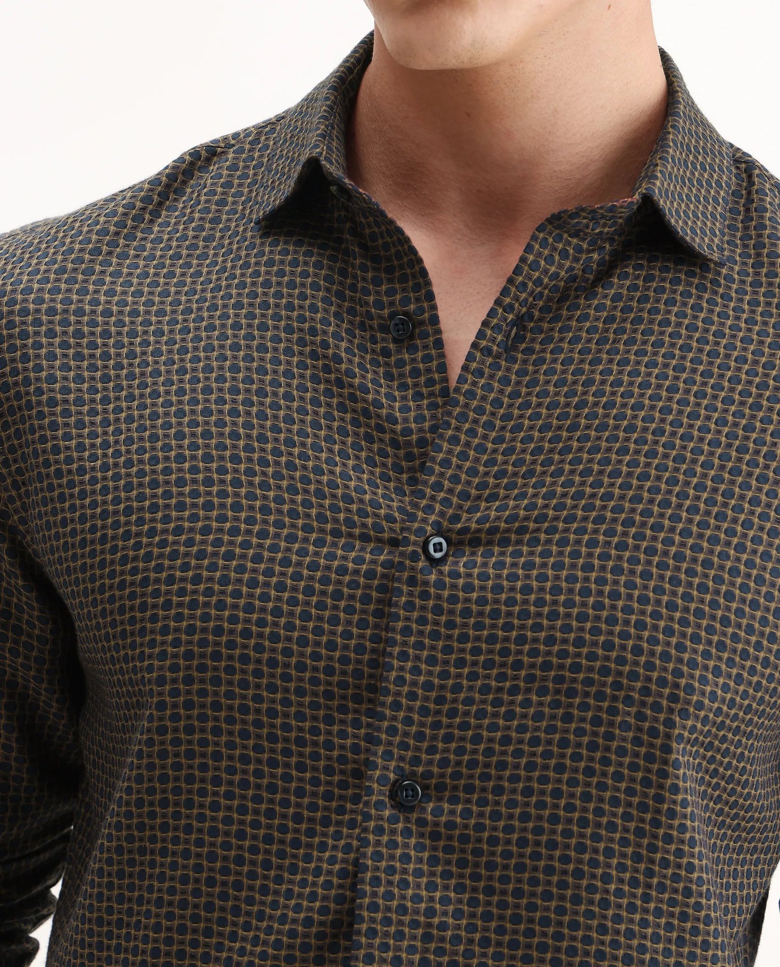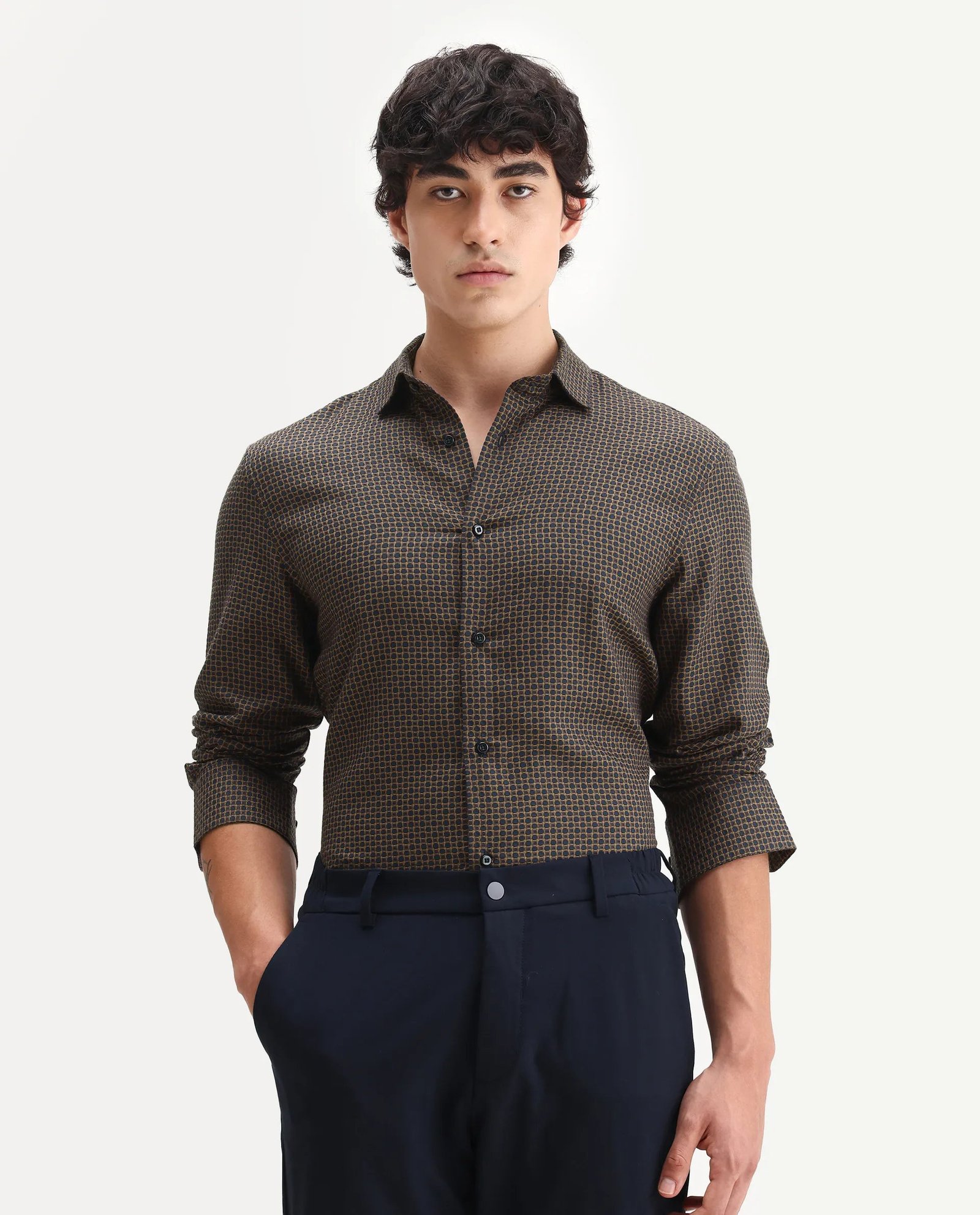 Elevate your wardrobe with the Rare Rabbit Men’s Juxe shirt. crafted from breathable cotton fabric for all-day comfort. Designed with a spread collar and regular fit. it offers a blend of classic style and modern ease. The subtle geometric print adds a refined visual interest. making it versatile for both office and casual settings. Durable and easy to maintain. this shirt ensures a polished look with minimal effort.