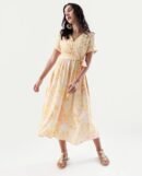 Elevate your wardrobe with this sophisticated yellow midi dress featuring an elegant overlap neck and convenient elastic closure. The flattering flared silhouette creates graceful movement while the distinctive print adds visual interest. Meticulously crafted for both comfort and style. this versatile piece transitions effortlessly from day to evening occasions.