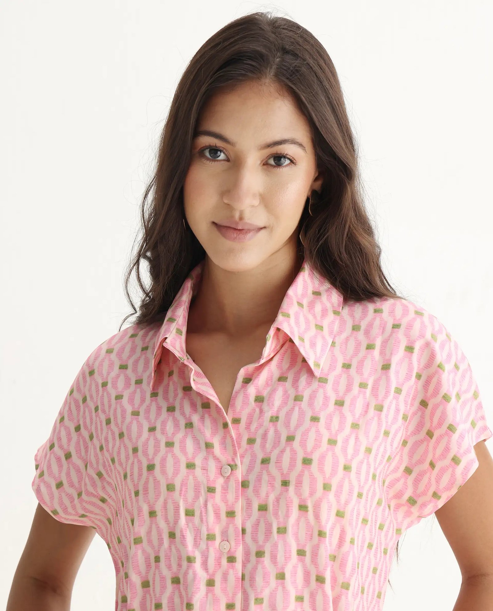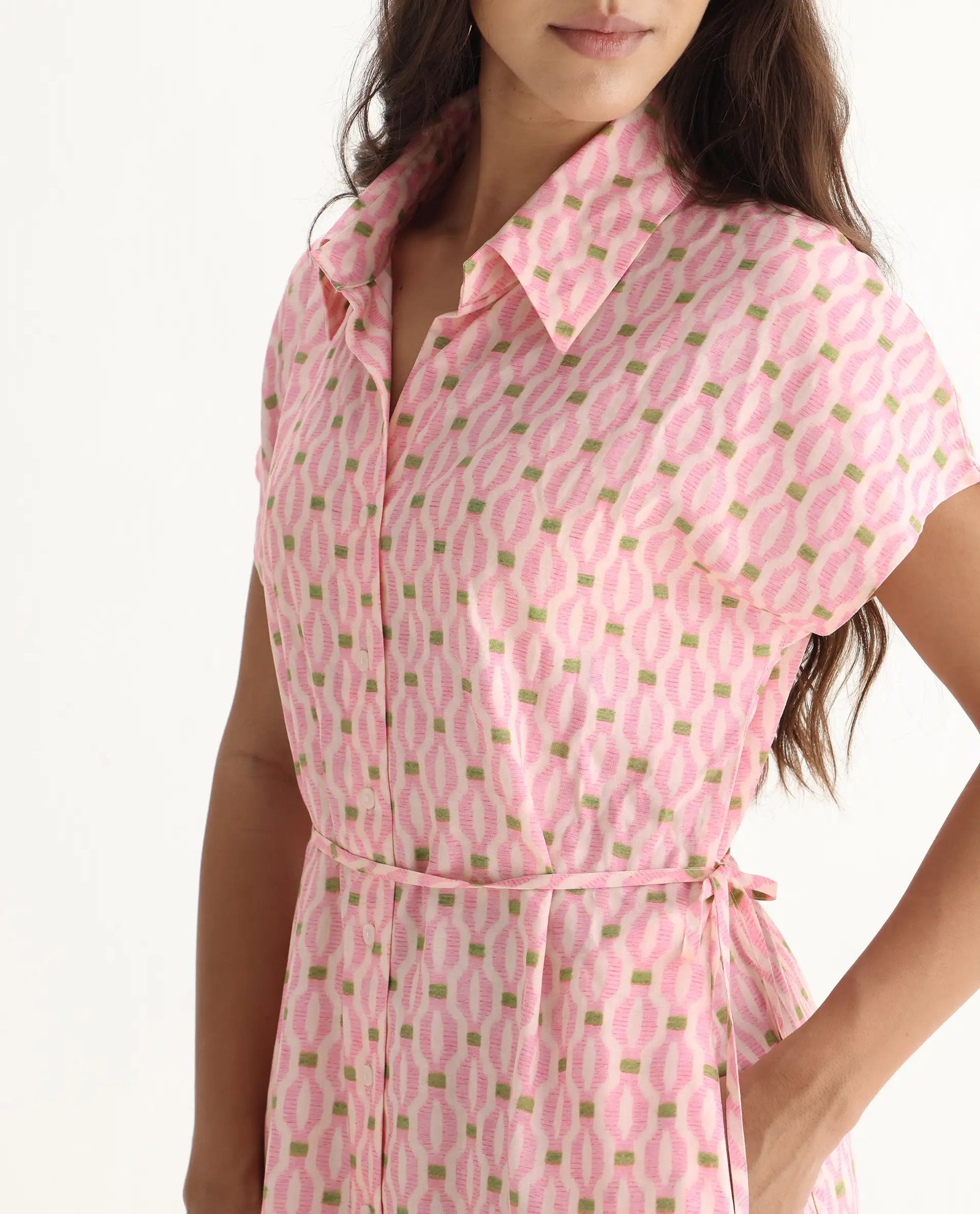 This Rareism Eleen Pink dress features a classic collared neck and button closure. combining elegance with ease of wear. Its A-line silhouette flatters various body types. while the midi length offers a versatile option for both casual and semi-formal occasions. The printed fabric adds a subtle yet stylish touch. making it a refined choice for your wardrobe.