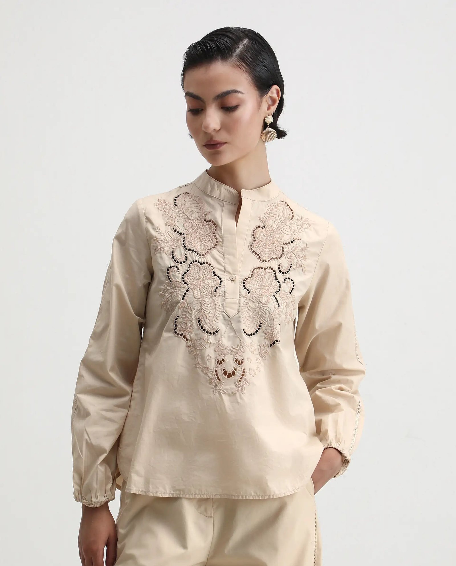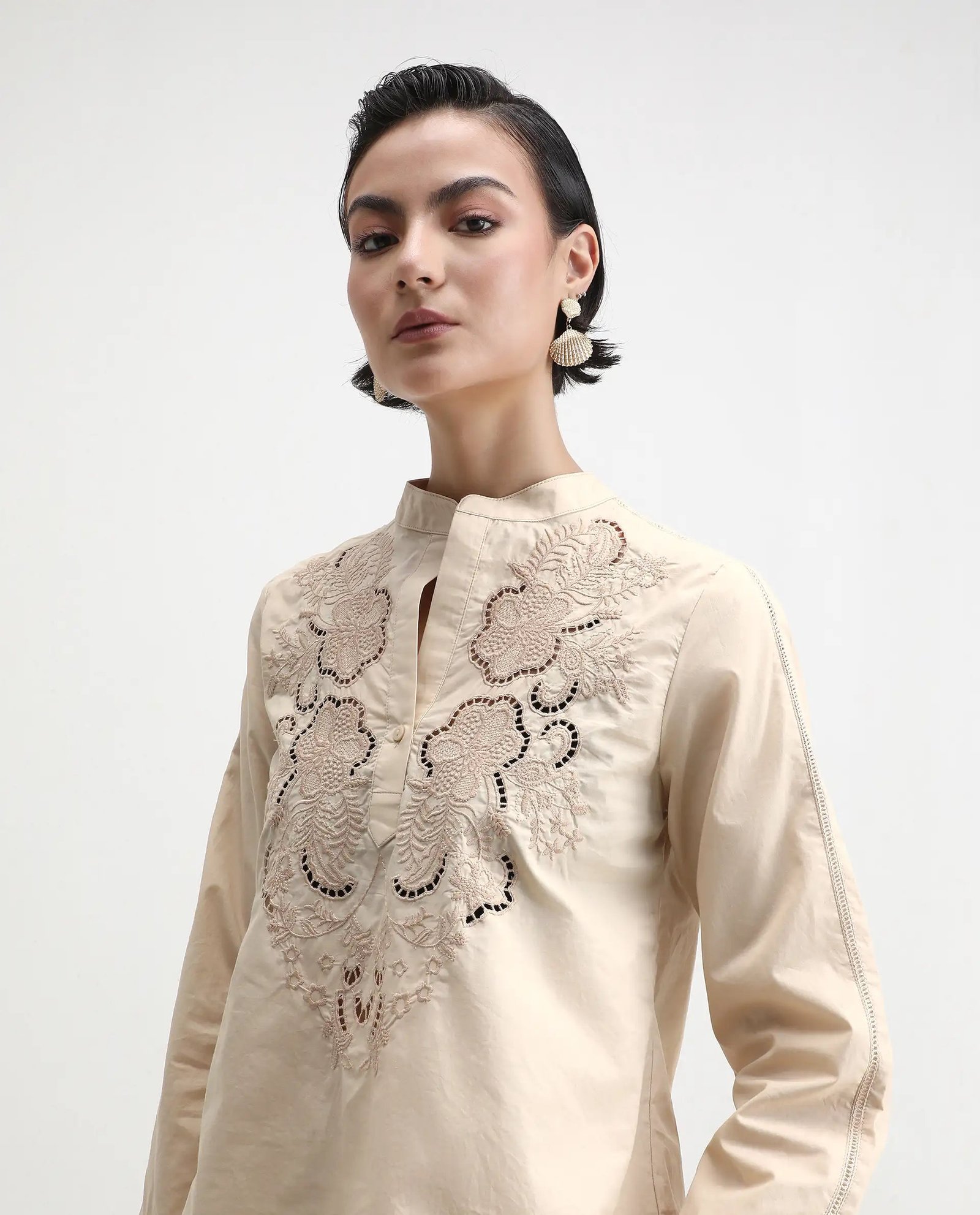 This Rareism women’s top features a beige cotton fabric with full sleeves and a mandarin collar. offering a refined and comfortable fit. The button closure enhances ease of wear. while delicate embroidery adds a subtle touch of elegance. Ideal for those seeking a blend of traditional craftsmanship and modern style in their wardrobe.